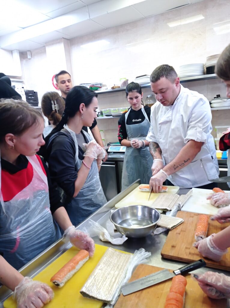 Для здобувачів освітніх програм “Готельно-ресторанна справа” (у рамках дисципліни “Нутриціологія”, доцент Зеленська О.О.) і “Туризм” було організовано й проведено майстер-клас із виготовлення суші на базі La Pizza Espresso. Проводили захід висококласні фахівці ресторанної справи з багаторічним досвідом роботи, зокрема шеф-кухар закладу – Кукобко Ігор Олександрович. Майстер-клас виявився дуже цікавим, практично значущим і забарвленим позитивними емоціями учасників, які здобували навички виготовлення суші. Звісно, гастрономічна насолода також була присутньою, оскільки наприкінці заходу студенти посмакувати приготованими власноруч ролами. Традиційно увагу було приділено і можливостям потенційного працевлаштування наших здобувачів вищої освіти. Майстер-клас досвідчених професіоналів ресторанної справи неймовірно сподобався всім студентам! Велика подяка нашим роботодавцям, особливо Ігорю Олександровичу за гостинність, високий професіоналізм, приділений час і за те, що діляться з молоддю своїми знаннями та допомагають опановувати практичні навички!