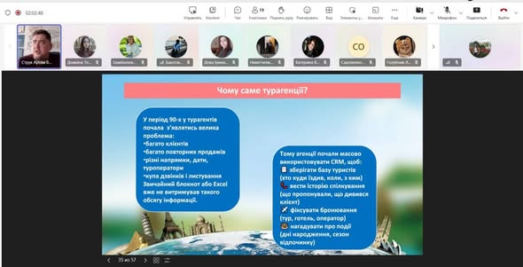 Для студентів освітньої програми “Туризм” директором турагенції “СтрукТур” 13 березня було проведено чергову гостьову лекцію на тему: “Туризм online: нові реалії ведення бізнесу”. Струк Артем Володимирович познайомив наших здобувачів із роботою спеціалізованого програмного забезпечення в туризмі, що є дуже актуальним, оскільки сучасна туристична індустрія значною мірою функціонує саме на основі цифрових технологій та автоматизованих систем управління. На лекції студенти ознайомилися з реальними технологічними інструментами, які використовуються у повсякденній роботі туристичних агентств і забезпечують пошук і бронювання туристичних послуг, управління клієнтськими базами, формування туристичних пакетів, облік продажів та автоматизацію документообігу. Регулярна співпраця зі Струком А.В. та ін. професіоналами-практиками забезпечує формування у здобувачів базових навичок роботи з професійними цифровими системами бронювання та управління туристичними послугами, знайомить з актуальними тенденціями цифровізації туристичної галузі, автоматизації процесів обслуговування туристів та інтеграції онлайн-платформ у діяльність туристичних підприємств. Щиро дякуємо Артему Володимировичу за багаторічну регулярну співпрацю з нашим університетом і бажаємо процвітання його бізнесу й задоволення від професійної діяльності! Березень 23, 2026 katur